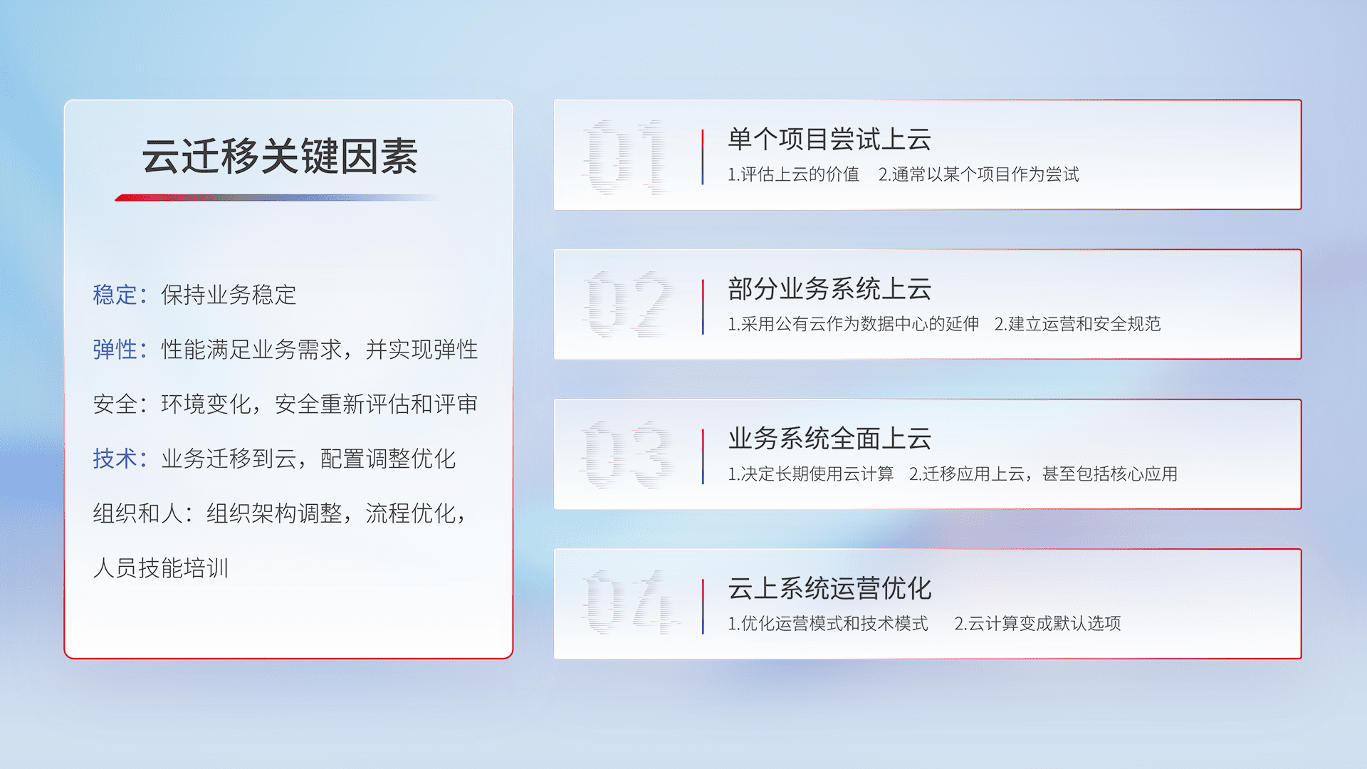 结合实际业务,,从规划设计、、、、云平台选型、、、云原生改造、、、、数据迁移、、、、集成交付,,,,迁移全过程为客户识别最佳上云路径,,,做好风险识别管理,,设计网络架构、、身份权限、、安全审计合规、、操作审计、、、日志审计、、、监控告警策略、、、、多站点容灾设计等,,,对云上基础设施进行整体规划,,,,提升IT治理水平,,,,以满足弹性、、高可用、、高性能的需求。。。。